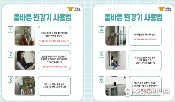 (충남도민일보(도민방송) 정연호기자) 천안서북소방서(서장 강기원)는 건물 내 화재 발생 시 통로 및 계단을 통해 피난이 불가능할 경우 창문에 설치되어 이용할 수 있는 ‘완강기’ 사용법을 적극 홍보한다고 밝혔다.