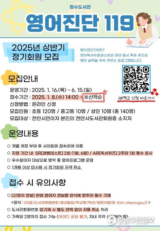 (충남도민일보(도민방송) 정연호기자) 천안시 청수도서관은 2025년에도 인기 영어 학습 프로그램 ‘영어진단 119’를 계속 운영한다고 26일 밝혔다.