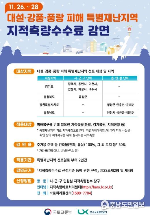 (충남도민일보(도민방송) 정연호기자) 천안시는 지난달 폭설 피해로, 특별재난지역으로 지정됨에 따라 피해 복구를 위한 지적측량 수수료를 감면한다고 27일 밝혔다.