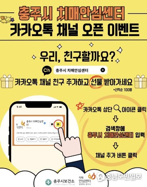 특히, 채널 개설을 기념하여 17일부터 충주시 치매안심센터 카카오톡 채널을 친구로 추가한 후 센터를 방문하는 선착순 100명에게 홍보 물품을 제공하는 이벤트도 함께 진행된다.