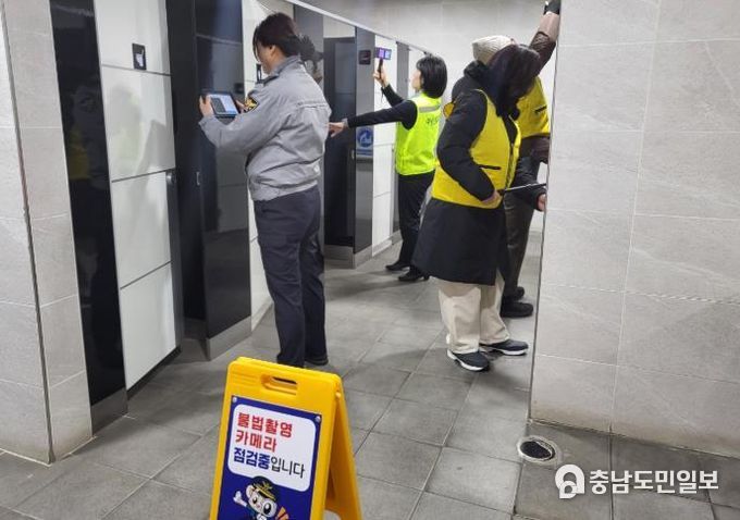 (충남도민일보(도민방송) 정연호기자) 코레일 충주관리역이 21일 오전 충주역 고객화장실에서 충주경찰서 여성청소년계, 충주시 톡톡 시민참여단과 합동하여 불법촬영 점검을 진행했다.