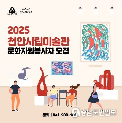 (충남도민일보(도민방송) 정연호기자) 천안문화재단은 오는 24일~ 2월 6일 천안시립미술관 문화자원봉사자를 모집한다고 22일 밝혔다.