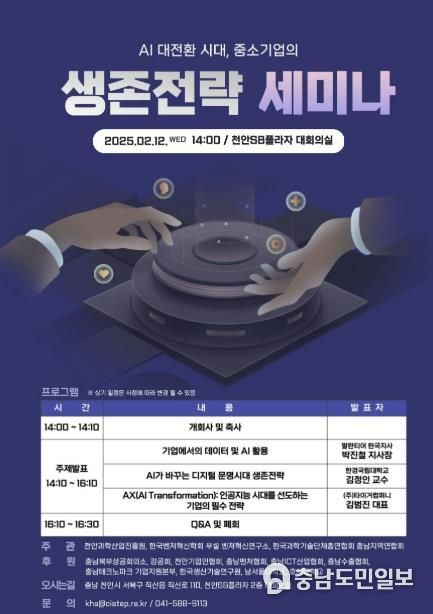 (충남도민일보(도민방송) 정연호기자) 천안과학산업진흥원은 오는 12일 천안SB플라자에서 AI 대전환 시대의 중소기업 생존전략 세미나를 개최한다고 밝혔다.