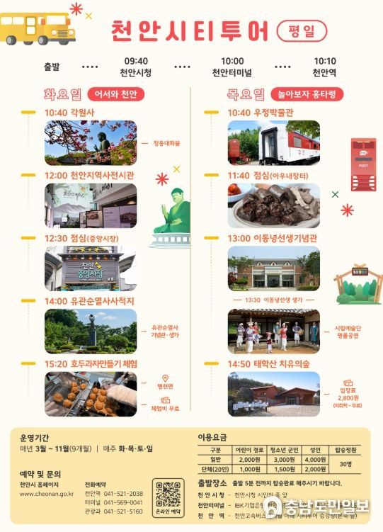올해 천안시티투어는 3월부터 11월까지 9개월간 매주 화·목·토·일요일 주 4회 운행된다.