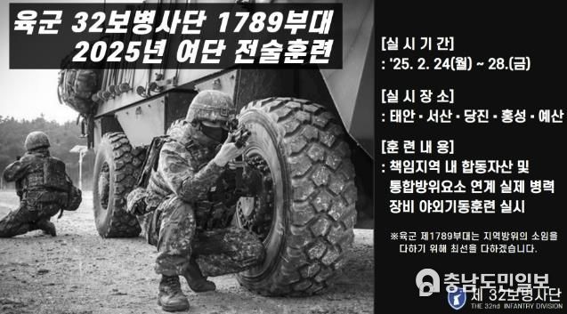 (충남도민일보(도민방송) 정연호기자) 육군 제1789부대는 오는 24일부터 28일까지 태안ㆍ서산ㆍ당진ㆍ홍성ㆍ예산 지역에서 여단 전술훈련을 실시한다.