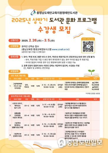 (충남도민일보(도민방송) 문성호기자) 충청남도태안교육지원청태안도서관(윤병훈)은 지역주민을 대상으로 2025년 상반기 도서관 문화 프로그램 수강생을 2월 26일(수)부터 모집한다.