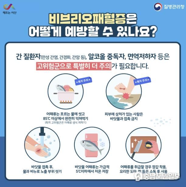 예방 수칙은 ▲어패류 반드시 익혀 먹기(85℃ 이상 온도에서 1분 이상 조리) ▲피부 상처가 있는 경우 바닷물 접촉 금지 ▲생굴이나 어패류 취급 시 장갑 사용 등이다.