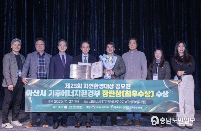 (충남도민일보 =아산) 정연호기자/아산시는 27일 서울 aT센터에서 열린 ‘제25회 자연환경대상 공모전’ 시상식에서 복원사업 부문 ‘최우수상(장관상)’을 수상했다고 밝혔다.