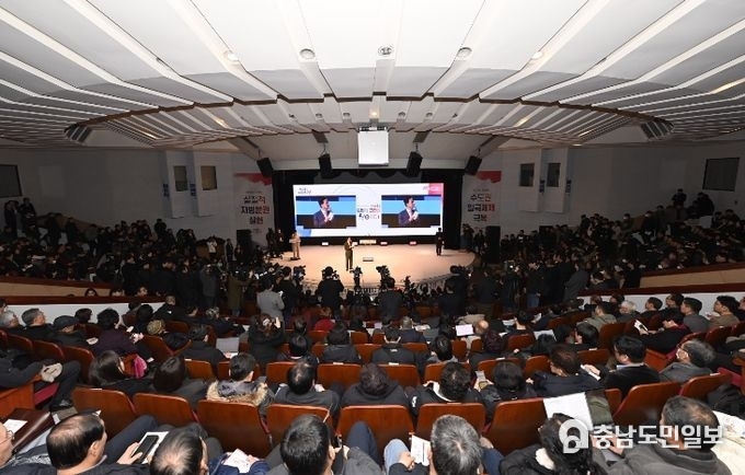 도는 4일 단국대 천안캠퍼스에서 김 지사와 홍성현 도의회 의장, 시장·군수 또는 부단체장, 도와 시군 의회 의원, 사회단체 대표와 전문가, 주민 등 1200여 명이 참석한 가운데 대전·충남 행정통합 타운홀 미팅을 개최했다.