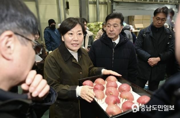 (충남도민일보 =예산) 정연호기자/ 예산군은 송미령 농림축산식품부 장관이 지난 7일 예산농산물유통센터를 방문해 설 성수품인 사과의 저장 및 공급 상황을 점검했다고 밝혔다.