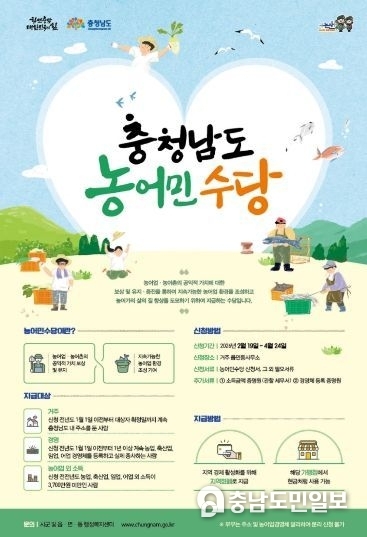 (충남도민일보 =논산) 정연호기자/ 논산시가 오는 2월 19일부터 4월 24일까지 충청남도 농어민수당 신청을 접수한다.