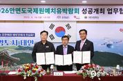 (충남도민일보) 충남도가 ‘2026 안면도 국제원예·치유박람회’ 국제공인 획득 등 성공 개최 추진을 위해 태안군, 국제원예생산자협회(AIPH) 한국위원회와 손을 맞잡았다. 도와 태안군, AIPH 한국위원회는 14일 태안군청 소회의실에서 전형식 도 정무부지사, 가세로 태안군수, 안홍균 AIPH 한국위원회 대표 등이 참석한 가운데 협약을 체결했다. 협약에 따르면, 도와 태안군, AIPH 한국위원회는 행사 성공 추진을 위해 국제박람회 공인 및 심사·계획·감독·운영·사후관리, 박람회 전반 운영 조력, 국내외 자료 조사 및 세미나 개최, 박람회 업무 지원 및 대국민 홍보, 박람회 및 연계 사업 행·재정적 지원 등을 공동 협력키로 했다. 국제박람회 공인은 AIPH에서 받는다. AIPH 공인이 있어야 ‘국제’ 용어를 공식적으로 사용할 수 있고, 원예산업 관련 국제(외국) 전문가 참가 확대 등을 이끌 수 있다. 또 박람회 국제 위상 제고와 신기술 도입 등 원예산업 세계화, K-원예치유산업 국제적 위상 재정립도 견인할 수 있다. AIPH는 1948년 스위스에서 설립하고, 현재 벨기에 브뤼셀에 소재하고 있는 국제비정부기구다. 31개 회원국이 가입해 있으