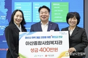 (충남도민일보 =아산) 정연호기자/ 아산시는 아산종합사회복지관이 지난 17일, ‘세대통합 온(溫)마을 축제 가치놀자, 함께놀자’를 통해 마련한 후원금과 부스 운영 수익금을 아산시에 전달했다고 밝혔다. ‘세대통합 온(溫)마을 축제’는 아동·청소년, 청년, 어르신 등 모든 세대가 함께 어울리며 소통과 공감의 가치를 나누는 행사로, 복지관이 주도적으로 기획하고 지역사회·기업·개인이 한마음으로 참여해 취약계층을 돕고자 마련됐다. 이번에 전달된 후원금은 아산시 취약계층 지원에 사용될 예정이며, 축제의 즐거움이 이웃의 따뜻한 겨울나기로 이어지는 선한 영향력의 출발점이 되고 있다. 이영해 관장은 “시민이 함께 웃고 나누는 축제를 통해 지역사회가 한층 더 따뜻하게 하나 되는 모습을 보았다”며 “앞으로도 세대와 계층을 아우르는 복지관으로서 아산의 행복공동체를 만드는 데 최선을 다하겠다”고 말했다. 오세현 아산시장은 “항상 지역 복지 향상과 나눔 문화 확산에 앞장서 온 아산종합사회복지관과 참여자 여러분께 깊이 감사드린다”며 “후원금이 도움이 필요한 이웃에게 소중히 전달되도록 하겠다”고 말했다.