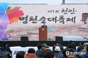 (충남도민일보(도민방송) =천안) 정연호기자/ 올해 처음으로 열린 ‘제1회 천안병천순대축제’가 18일부터 19일 성황리에 마무리됐다. 천안병천순대축제는 병천면에 순대집이 자리잡기 시작한 1960년대 이후 60여 년 만에 개최되는 것으로, ‘병천순대! 지역을 넘어 K-FOOD의 중심으로!’를 주제로 전놀부네·자매순대 일원에서 열렸다. 축제 첫날인 18일에는 시립풍물단·무용단의 식전공연과 축제의 하이라이트인 ‘순대커팅식’으로 시작을 알렸다. 이와 함께 병천초등·중학교 학생들과 문화원 어르신들이 난타, 밴드, 통기타, 색소폰 공연을 선보이며 갈고닦은 실력을 뽐냈다. 19일에는 TV조선 ‘싱코리아’ 병천면편이 열려 주민들의 노래와 춤 실력을 뽐냈다. 또 유명가수인 태진아, 강진, 문희옥 등이 출연해 축제를 빛냈다. 공연 외에도 독립성지 스탬프 투어와 독립만세운동 의상 대여, 병천면 홍보부스를 운영해 아우내 독립만세 운동의 고장인 병천면을 알렸다. 김일호 병천순대거리협회장은 “이번 축제를 시작으로 병천순대가 지역을 넘어 전국의 대표 먹거리로, K-푸드의 한 축으로 자리매김할 수 있도록 노력할 것”이라고 말했다. 김석필 천안시장 권한대행 부시장은 “풍성한 수확의 계절을